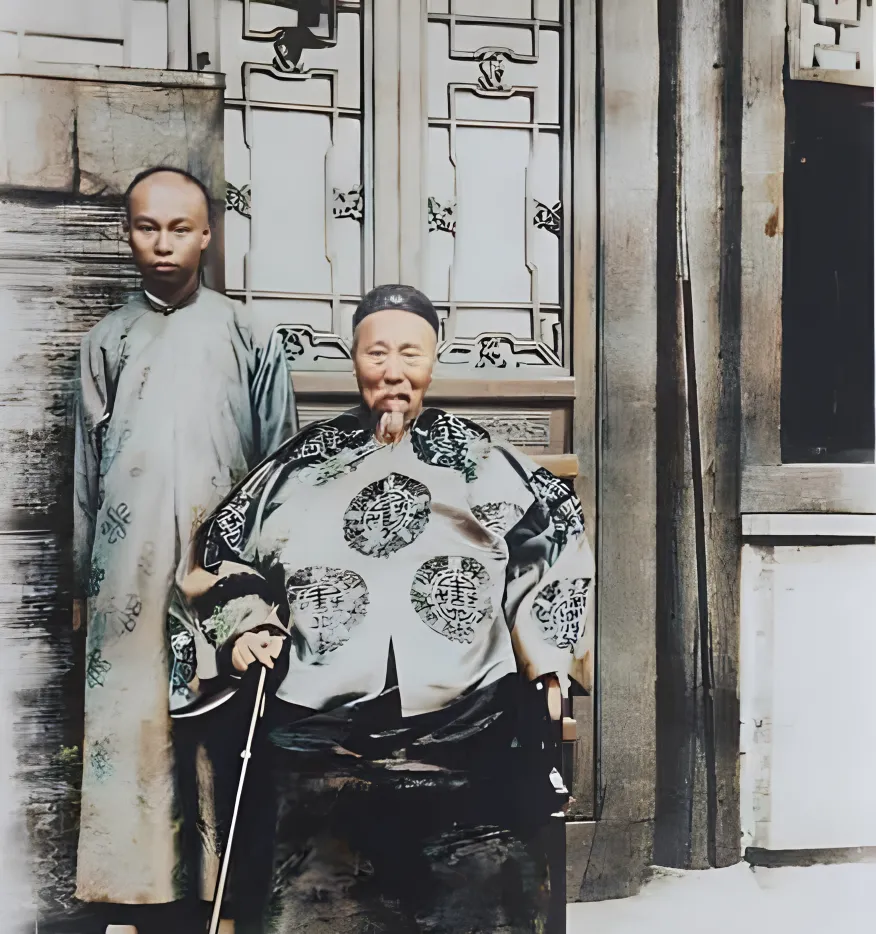 图中这对父子叫李鸿章与李经迈,院门口的格扇窗雕着回纹,老爷子坐一把圈椅,手里拄着黑漆手杖,身上那件石青底团寿纹褂子亮得很,光一打就泛油,儿子立在一侧,青灰长袍直垂到脚背,神情还带点紧,像第一次陪长辈见客的样子。这张的妙处在坐与立,老一辈讲礼数,谁坐谁站有讲究,家里长辈常说,陪坐要看辈分,照片里全写在身段上了。以前照相得挑日头,穿丝绸更显体面,现在手机咔咔两下就完事了,规矩散了,可有时候也想想,那根杖、那把椅,都是身份的外沿。