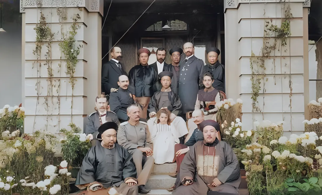 这张合影里有李鸿章,人多,前排两位穿的是深色大褂,园子里花事正盛,菊丛挤到台阶边,几位洋人在中间站直了,左边那位军装上肩章亮亮的,孩子坐在中央,手指卷着裙边,像是被大人们的阵仗怔住了。以前合影得先摆好位,谁在前谁在后有规矩,现在大家随手一坐就拍,可要凑成这种层次,还得有人喊一声靠一靠。
