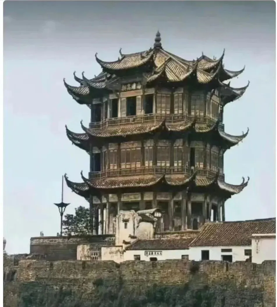 图中这座重檐九脊的楼叫黄鹤楼,木梁漆色沉稳,飞檐像一只只展翅的鹤把天边挑了起来,老相片里看更显筋骨,窗棂密密,檐角翘得利落,爷爷说年轻时坐渡船过江,抬头就看见它端在蛇山之巅,风一吹,檐铃细细地响,像有人在耳边念过往。