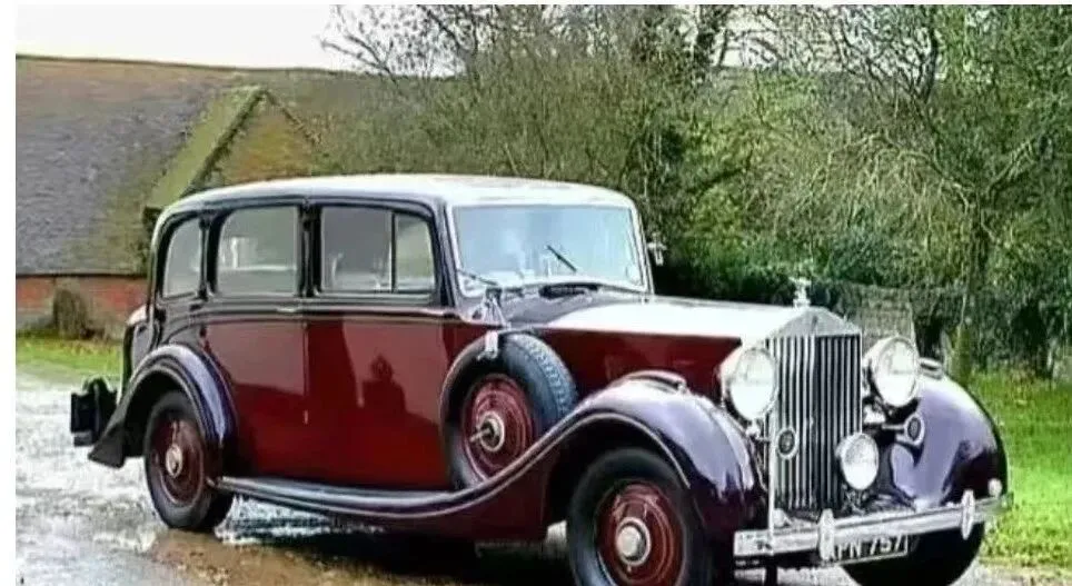 这个酒红色的老家伙叫劳斯莱斯幻影,圆鼓鼓的翼子板把前后轮罩得严严实实,立标挺胸站在银色格栅上,侧面一圈备胎像挎了个皮鼓,爸爸看见这张就嘟囔,说当年见过一次,发动机点火的声音不轰,像低声咳嗽,一脚油门,车身却悄没声儿地滑出去。