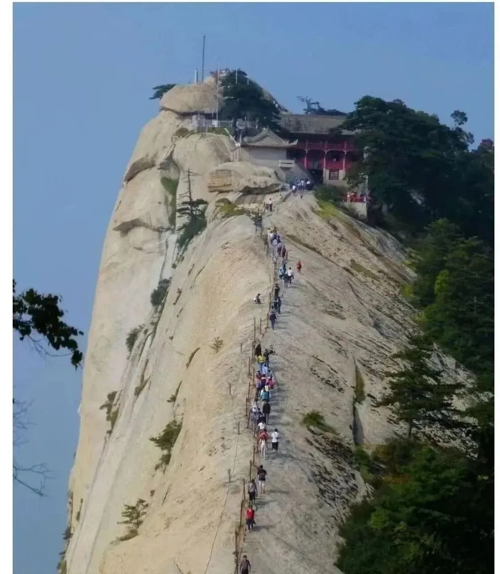 图里的险道叫华山青龙背,石脊窄得只容一条人影,铁链被手汗磨得发亮,脚底下是千丈深壑,风从两边同时灌过来,像在你耳边起哄,我第一次走这段,心口咚咚跳到喉咙眼儿,妈妈在后头喊别往下看,看前面,手一把把拽着链子,才敢往上挪一步。