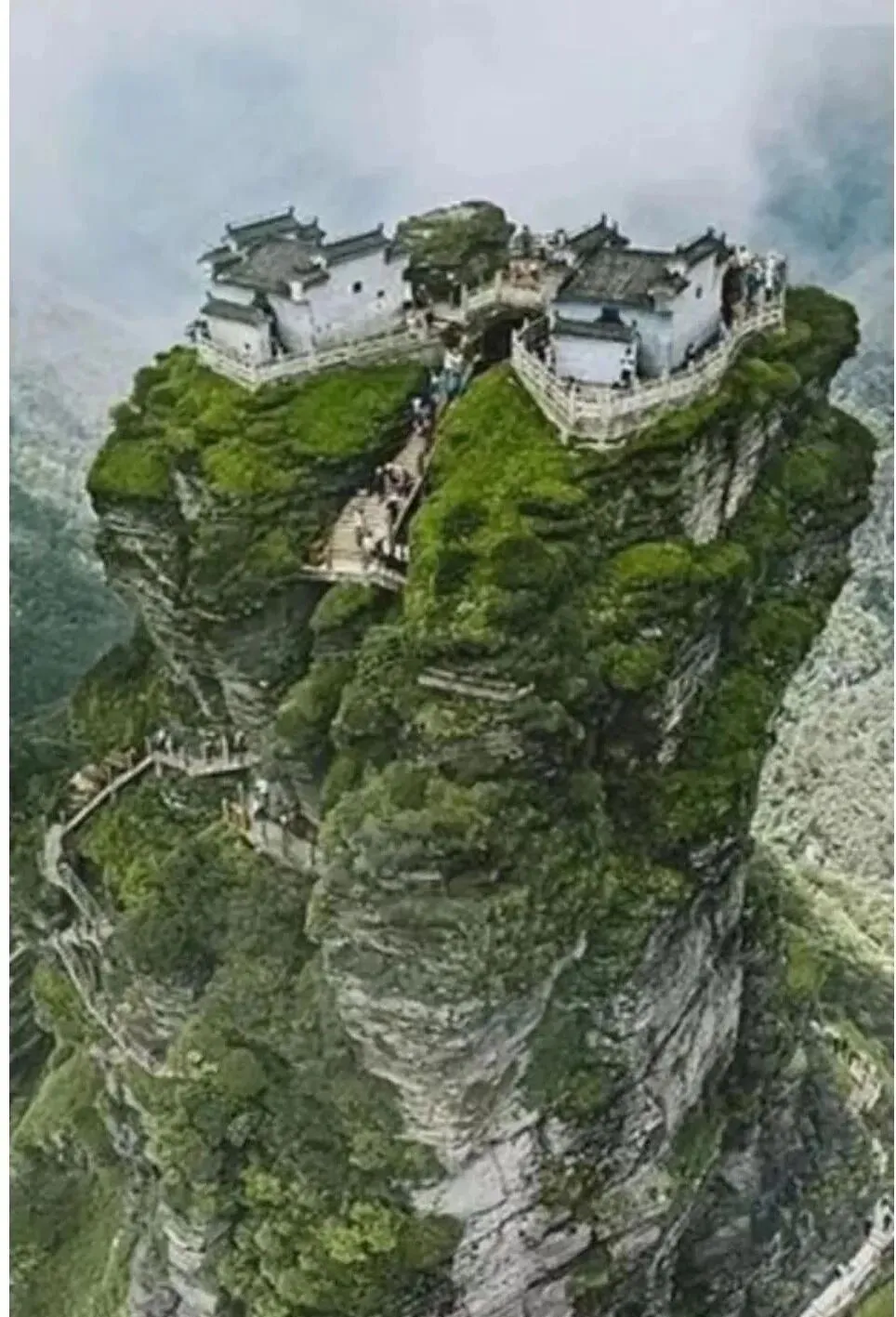 这块云上孤台叫梵净山金顶,两块石柱对立,观景台像搭在天空的桥,苔色把岩壁涂得发青,云雾一团团往上冒,像锅里腾的热汽,游客走在木栈道上,脚下悬空,心却被拽得稳稳的,老相机把它拍得朦朦胧胧,反倒更像梦里来过一次。