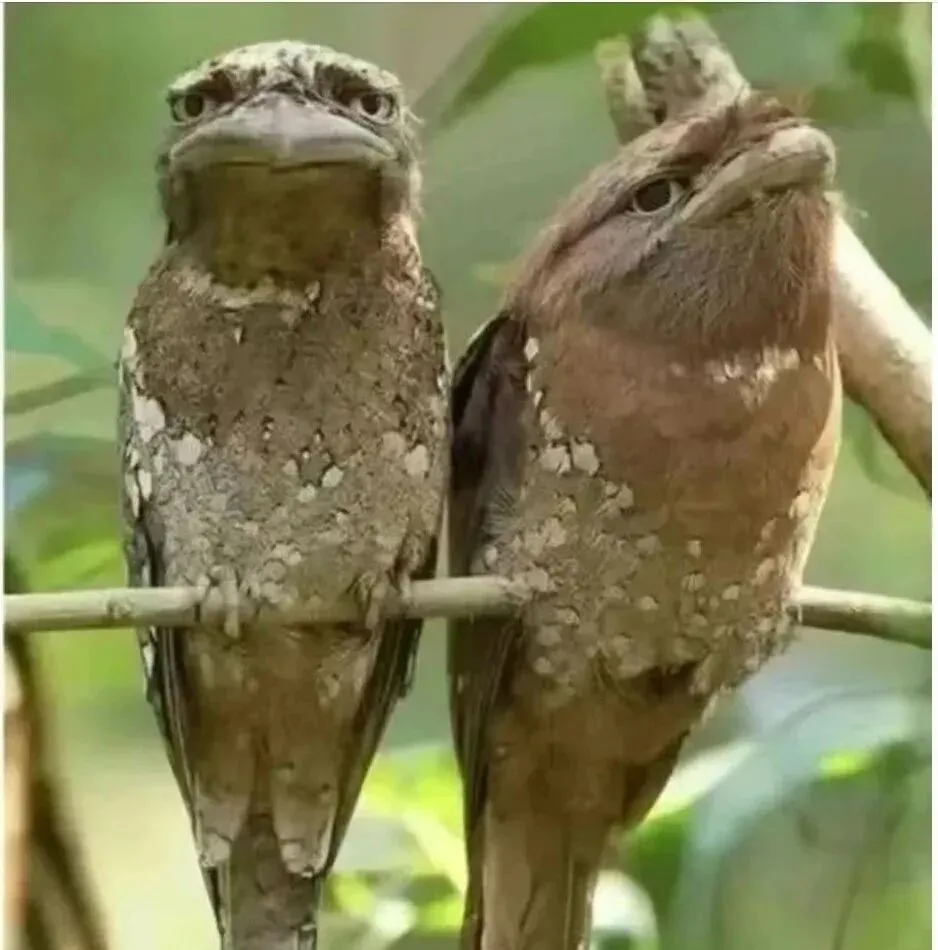 这对憨态的家伙叫蛙嘴夜鹰,头大喙扁,站在枝头像两尊石雕,眼神却机警得很,毛色一身枯叶纹,风一吹就和树皮混成一块儿,外公笑说它们飞不快,捉虫靠守株待兔,张嘴一合,虫子就没了踪影,以前我们只在图鉴里见到,现在手机镜头一放大,细毛都能数清。