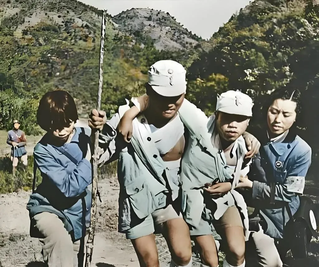 这个场景叫抬架子,左边小个子攥着木棍使劲儿撑,右边的护士袖口别着徽章,衣料是蓝灰棉布,汗渍一圈圈往外晕,泥路陡,伤兵咬着牙,脚下打滑的那一下我都替他揪心,以前转个伤员要走几里山道,现在救护车一按喇叭就到了,命的距离,就差在这几步路上。