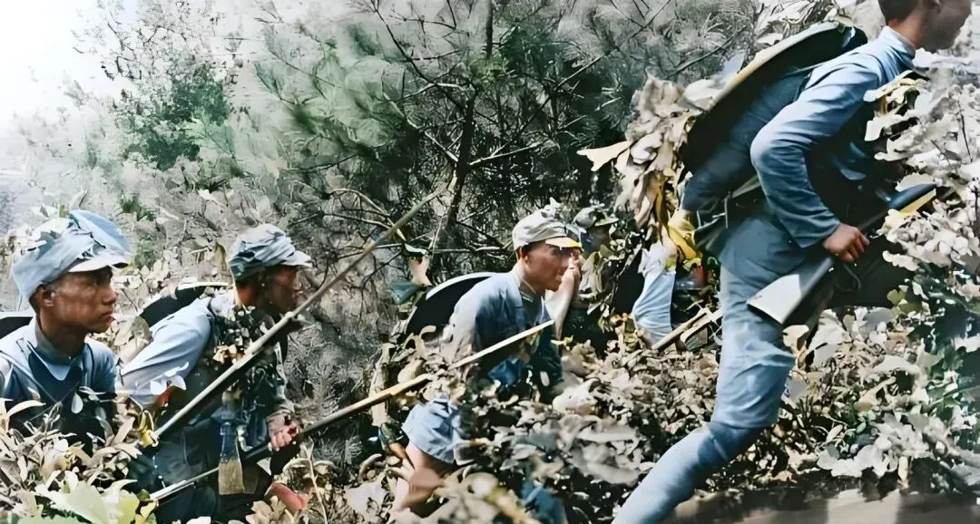 枝叶遮脸,帽上插着伪装草,手里攥着木柄刺刀,有人换成短枪,脚步从低处往高处踩,鞋底泥巴一层接一层,脸上只剩一道线的目光,别问苦不苦,这种爬坡的劲儿,现在上健身房也练不出来。