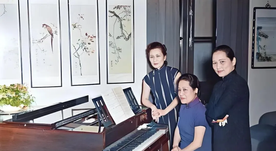 屋里摆着立式钢琴,木色温润,琴谱翻开在架上,三人或立或坐,光从百叶窗缝里斜斜打进来,衣料上的细纹都看得清,没多说话,气儿却很和,像演出前最后一次对拍,沉默也是一种阵线。
