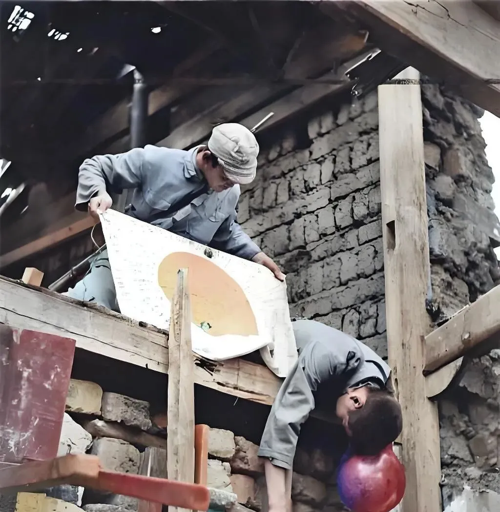 两个人扒在木梁上,一张色块醒目的布图被捏住一角,灰土从瓦缝筛下来,屋檐的破洞补了又破,木桩上刮痕乱糟糟,像我小时候在老屋里翻箱底,妈妈在下面喊小心钉子,图找着了没,找着了就是一条活路。