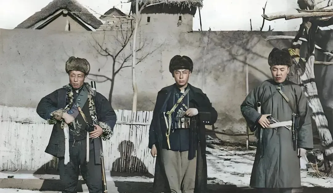 三个人穿厚棉大衣,皮草领子卷着风,腰间塞着短枪和子弹袋,站姿各不一样,中间那位手搭在胸前,脸冻得通红,鬓角全是霜,院墙后边杵着一根没皮的白杨,影子印在墙上,硬邦邦的,像他们说话一样干脆。