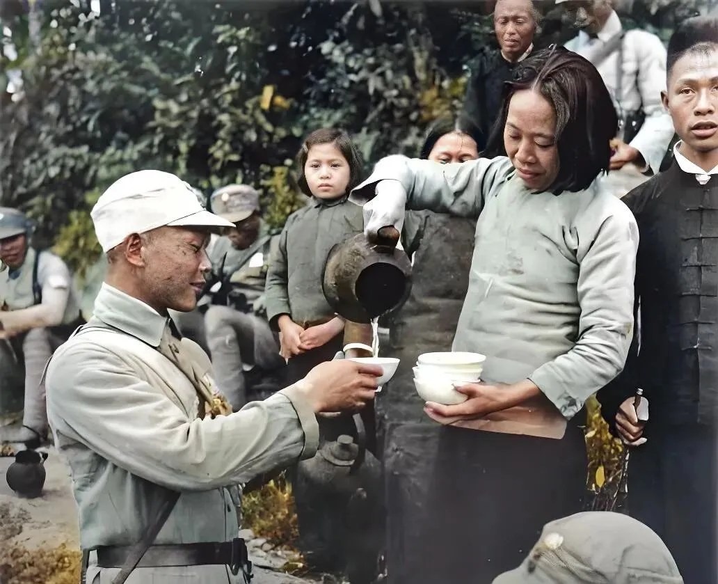 这张最暖,铁壶口歪,倒出来是热腾腾的米汤,士兵捧着粗瓷碗笑得腼腆,女子把壶抬高一点,袖子挽到胳膊肘,背后围着孩子和老人,脸上都是土,嘴边却干干净净,奶奶说那会儿能喝口热的,比啥都踏实。