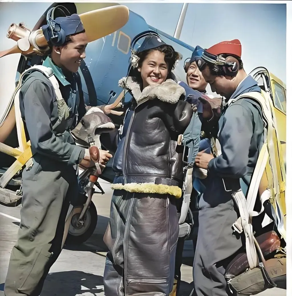 这个场景叫出征前的打趣,蓝黄相间的教练机在后头,四个人围成一圈,皮飞行服毛边厚得像面包,护目镜歪在帽檐上,女孩露出大大的笑窝,队友帮她整理背带,阳光下全是青春的劲儿,谁还记得怕呀,风一吹就要起飞。