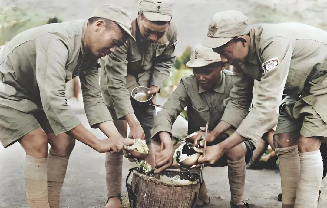 这几位围着一只旧竹筐,勺子咣当咣当地碰在一起,糙米饭里拌着青叶,碗边留下一圈亮油,袖口打着补丁却洗得干净,听他们说笑就像在我家老厨房门口,爷爷说在外面吃一口热饭,比打一仗还解气,吃饱了才有力气扛。