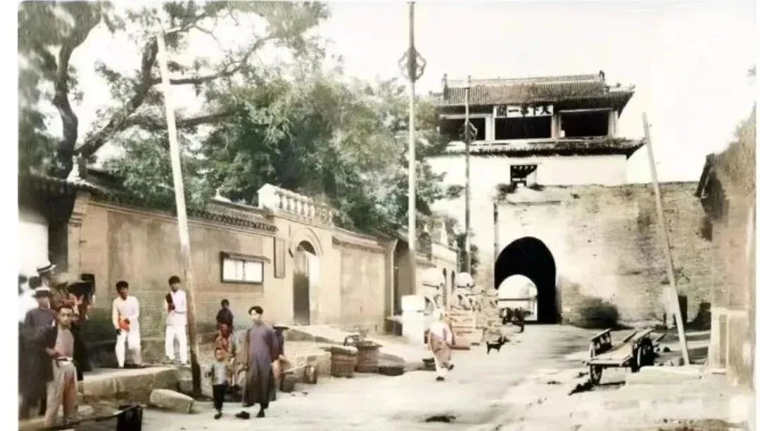 这个巷口场景叫小城关,土墙斑驳,木车靠边,挑担的、磨刀的、卖炭的都在门前打个照面,路当中那杆高挑的木杆子,小时候我一直当电线杆,其实是旗杆,节庆时挂条幡,风一来,呼啦直响。