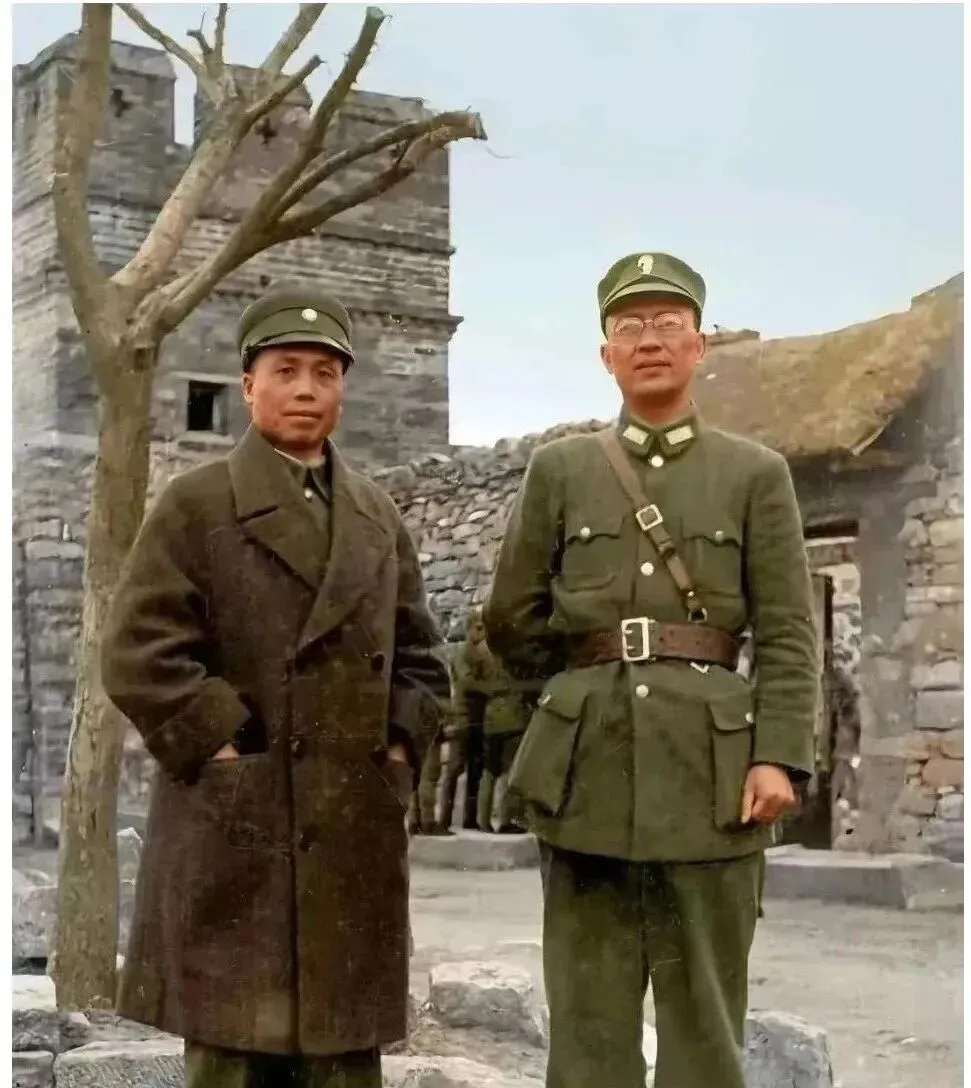 这张两位穿军装的合影叫战地照,左边呢绒大衣把腰身罩住,右边皮带绷得直,扣子亮,身后是石墙和枯树,风一看就冷,我外公指着腰间那条粗皮带说,把心一勒紧,怕的事就不怕了,以前人拍照像立阵,现在我们拍照像记录,心境也跟着变。