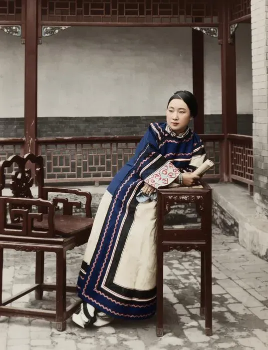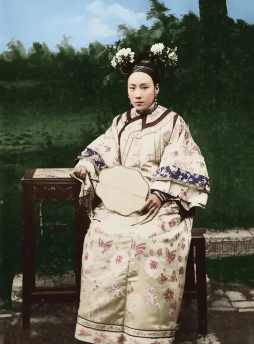 图中这位端坐的女子叫满洲贵妇,她的旗装一层叠一层,绸缎的面子在光下泛细腻的亮,袖口堆着花鸟纹样,边上压着规整的滚条,颜色不闹腾,却沉,像压在心口的老檀木香。