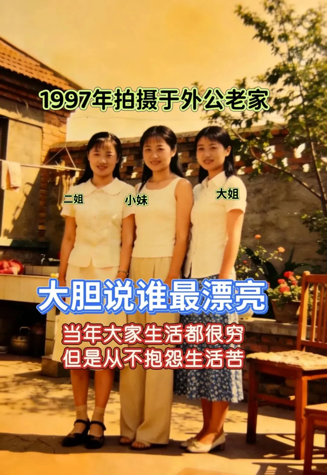 1997年,在外公老家的小院里,三个姑娘留下了这张泛黄的合影。