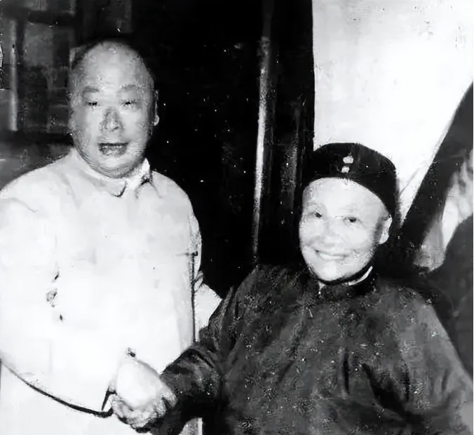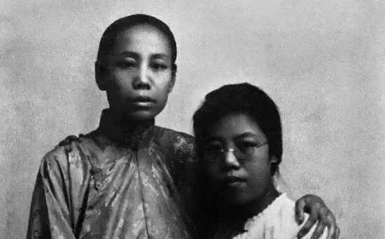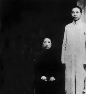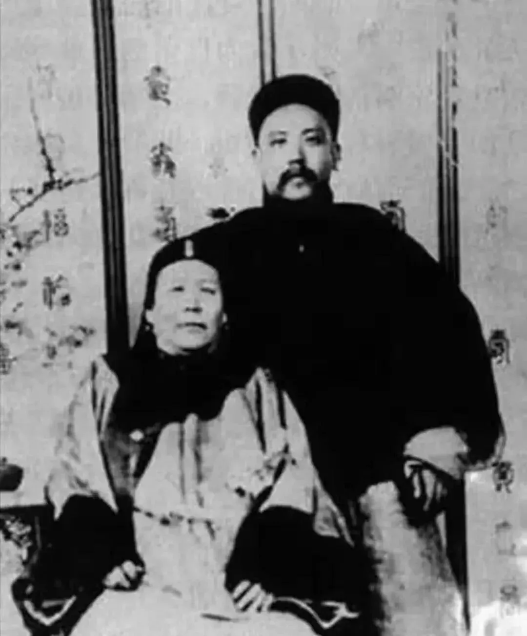 图中这对母子像馆里常见的布景背景,一黑一白的反差特别扎眼,年轻人瘦高穿着长衫站在一旁,母亲端坐在前景,手心叠着放在膝上,神情淡淡稳稳的,那会儿拍照是大事,先把衣襟理直,再把坐姿摆好,按下快门时谁都不笑,镜头里却把亲情压得更实在了。