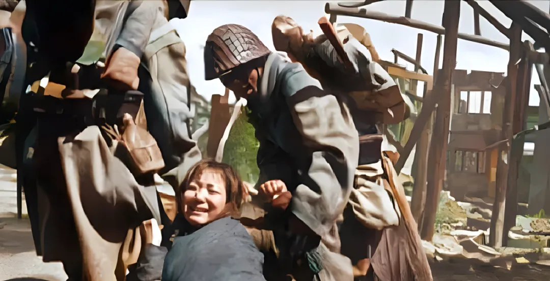 那一年七七事变后,城镇像被一只铁手抓住了喉咙,街口竖着临时的告示,破碎的梁柱把天空切成一块块,士兵的背包鼓鼓囊囊,水壶磕在腰侧,叮当地响,姑娘被往前拖的那一下,整张脸都扭了,仿佛在对着镜头求援,可镜头只是看,它救不了人。