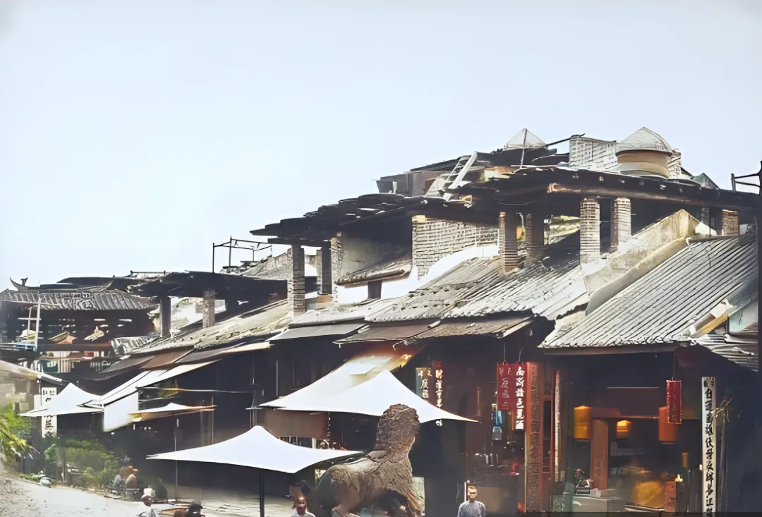 图里这一溜房檐叫惠爱大街的老面貌,瓦是灰的,檐口压着一圈圈木梁,招牌红漆黑字挂在廊下,风一吹,幌子就咯噔咯噔地响,铺面多,茶楼、布庄、药铺挤成一排,最醒目的还是那只蹲在口子上的石兽,像个不苟言笑的看门人,小时候我路过类似的骑楼街,总爱抬头找屋脊上的小兽,觉得它们会眨眼呢。