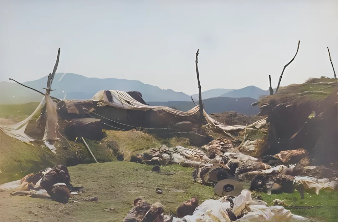 这个场景叫广城堡一带的战地残影,帐篷塌了,旗杆弯了,草地上一片兵器散乱,山影压着天边,静得只剩风声,这一幕不用多说,都是硬骨头躺下的样子,爷爷看类似的老照,低声说一句,人守住了尊严就不白走,这话不长,却比什么评书都有劲。