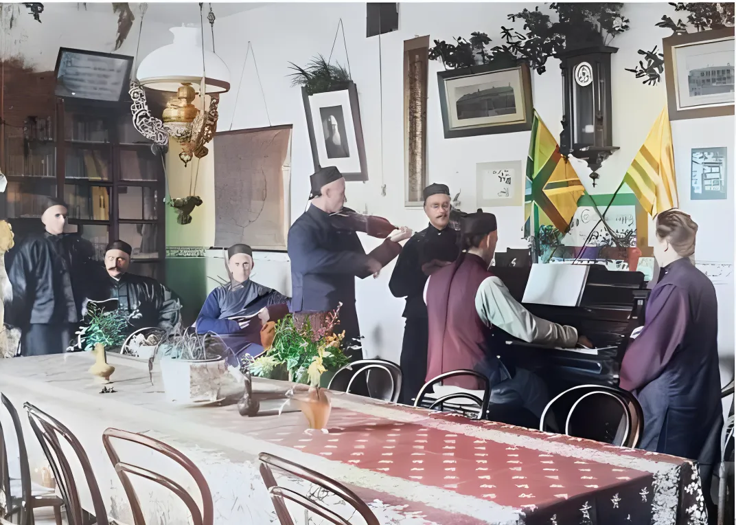 屋里最打眼的黑家伙叫钢琴,黑白键在灯罩子底下闪着光,一位穿长袍的清人坐正了,手腕抬起,旁边西方来的先生拿着提琴对音,墙上钟摆滴答,桌布花纹规整,茶盏边还压着乐谱,妈妈看见这张图笑说,当年哪有谁家摆这么多洋器物,现在孩子们学琴是家常饭,那时敢坐过去练,得有胆子也得有银两。