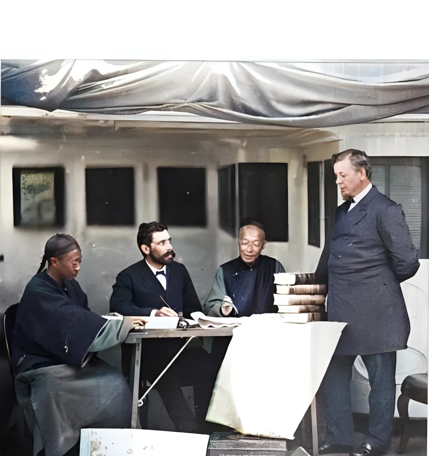 这几位合在一处的叫通事和西方官员,桌上摞着厚书,毛边都翘了,通事执笔,旁边人用指节点在纸上示意哪一行,旧时叫通译,干的是两头不讨好的活,奶奶念叨过,通事会几门话,出门不怵生人,可在乡里被叫“夷人身边人”,话糙理不糙,正是这些人,把门缝撬开了一条缝。