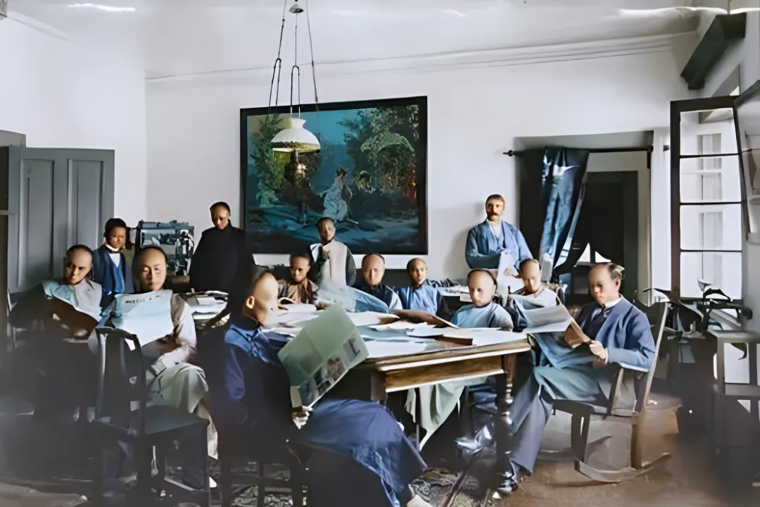 图中这屋子叫个“新学气”,长桌一摆,报纸摊得像块蓝布,几位戴眼镜的把版心按住防它卷回去,角落里有台机器,像印刷的小东西,窗扇开着,光线打在纸面发亮,我外公年轻时也有读报的习惯,早晨一碗稀饭一张报,先看要闻再看连载小说,他说报纸就是一扇窗,现在我们刷手机划一下十条新闻过去,快是快了,可那种把一张报读薄的专注,真不多见了。