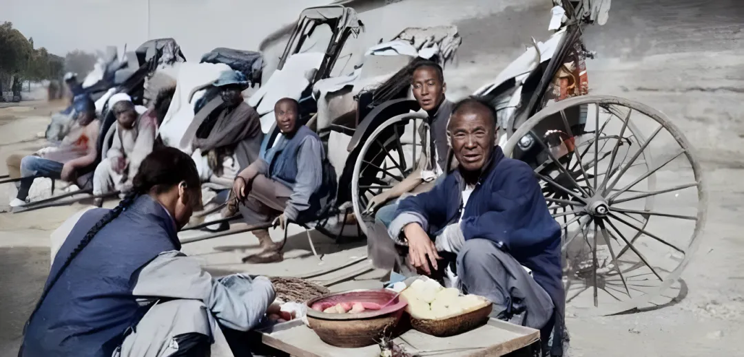 这条路边的家伙叫黄包车,车轱辘细高,辐条密,后头一排排靠着,前面摊主摆着木盆,果子切成块儿,买的人蹲着挑,车夫闲下来挨着车扶手打盹,脸上晒出一道道纹,我小时候跟着外婆上街,最爱蹲在卖豆腐脑的摊边听木勺磕碗,叮叮当当的,和这画面里的笑声是一路的,现在外卖一键下单,快得像变戏法,可摊前那点磨蹭,才是生活的咀嚼味。