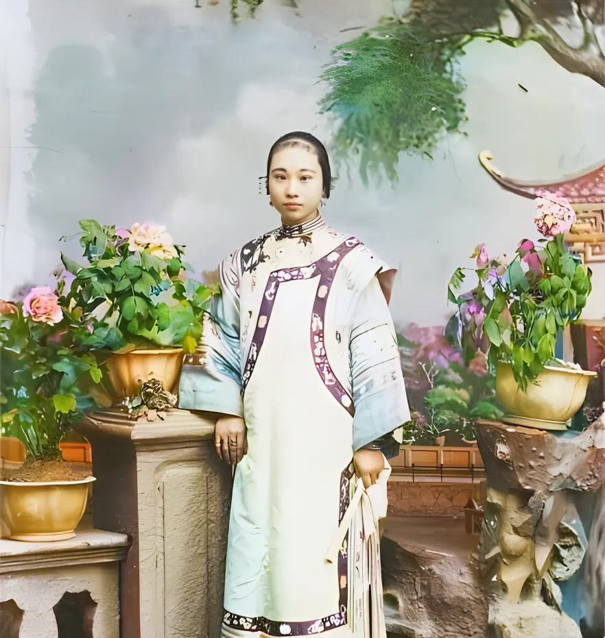 这位立在假山旁的叫闺秀像,衣襟平展,颈口那一圈暗纹收得紧,手里提着一把流苏扇,旁边三口金漆花盆,土色发干,能看出照相馆的讲究,先摆景再摆人,姨妈说当年拍照要站稳当,别眨眼,胶片一张顶一顿饭钱,现在我们拍照是连拍二十张挑一张,旧时是一击必中,成与不成全看那一瞬。
