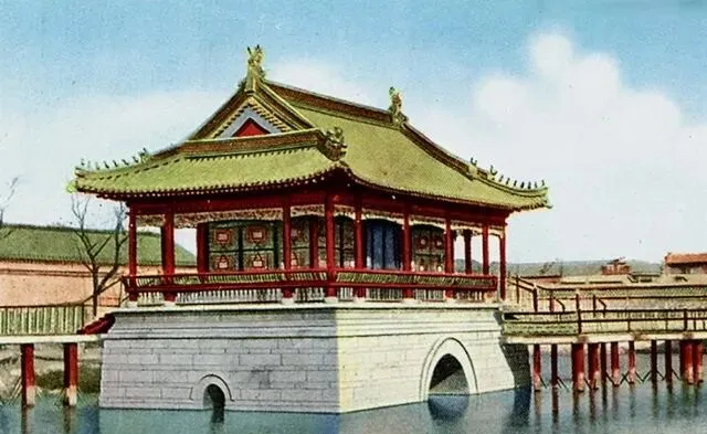 图中这处水上小亭叫李公祠边上的水榭,绿琉璃瓦压着飞檐,檐口挑着小铃铛,风一来就叮当两下,木栏刷得殷红,护墙是细密的格扇,底下是青白石台基,水从拱洞里慢悠悠地过,像是端着一碗清茶走路不撒汤,奶奶说当年逢节得穿新棉袄来烧香,孩子们围着石栏追鸽子,转一圈回去袖子都是香灰味儿。