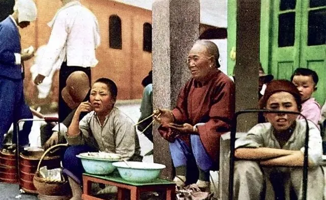 图里这几位摆的就是道边小吃摊,铜锅亮得照人,竹篮里码着馒头和荷叶饼,搪瓷盆里泡着粉条,炭火红着脸,婆婆手里捏着铜钱,讨价一回再加两根油炸的,坐在台阶上就着葱花汤咕嘟咕嘟往下送,老板抄起小铜勺敲一下锅沿当铃,脆生生一声,来客自会凑过来,现在我们吃夜宵也热闹,可多半对着外卖袋子蹲在沙发上,味是到位的,人情味薄了半分。