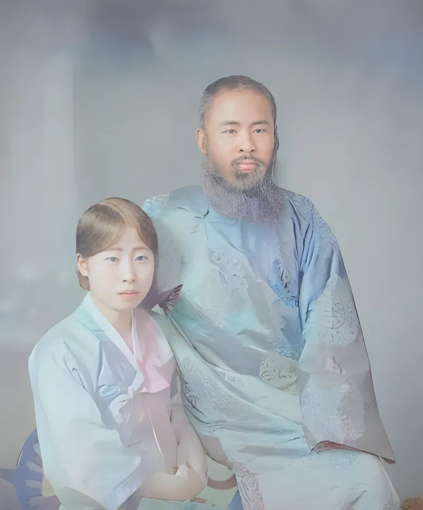 图中这身素淡的衣裳叫韩服,浅蓝叠白的交领,绸面发着温润的光,腰间用细带一系,坐得端端正正的人儿,眉目里带着一股子安静的倔强,这一身行头的讲究在料子和褶,薄却不透,褶一压就服帖,抬手落手都不炸毛,旁边那位披着宽大的长衫,胡须垂至胸前,布料上有云纹暗花,拍照时故意不看镜头,像在想着路上的山与水。