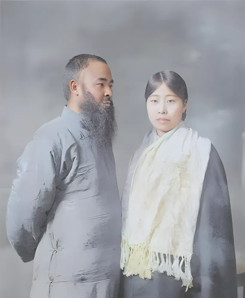 这个白茸茸的是羊毛围巾,流苏拖到腰,长衫用的是熟缎,领扣一粒一粒排着,男人的袖管有补丁,说明衣服不是新做的,拍照却偏要穿它,旧物上身更贴人,妈妈笑我说你小时候也挑旧衣,软和,说穿得顺手,现在我们追新款追版型,一季一换,倒也体面,就是和衣服的关系淡了,像住宾馆不如住自家炕那样的差别。