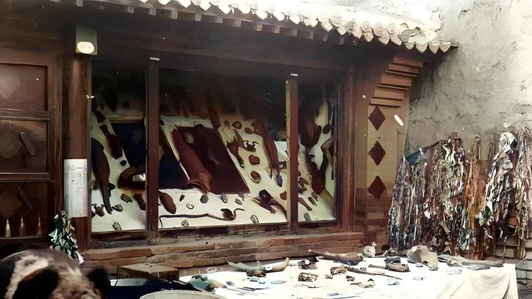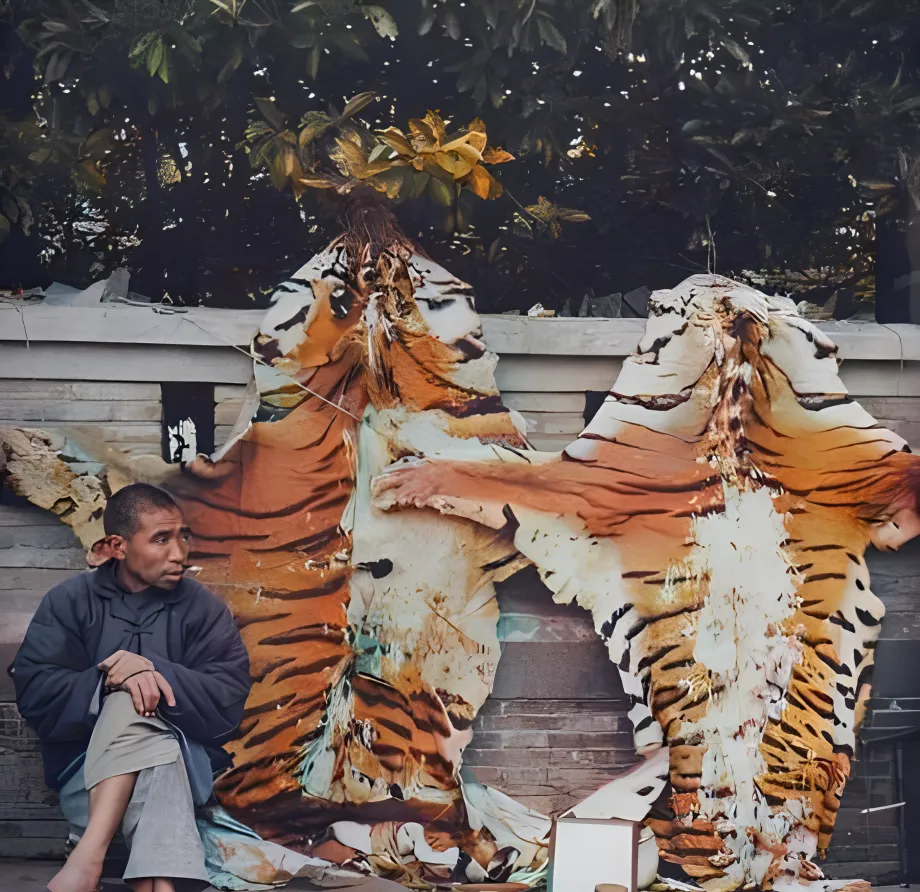 这个摊子好认,两张虎皮一左一右铺墙,纹路花得厉害,金黄里压着黑条,阳光一照油亮发光,地上还散着筋骨,摊主缩在凳上抽着风,眼睛却始终盯着来往脚步,老上海市声里,这一挂就是门面,豪客一来,手摸着毛顺着纹理往下抚,嘴里咂摸一句“真家伙”,如今讲生态保护,这一摊子在街上摆不了半刻,现在爱虎的人多了,街边留的是影楼里的仿皮毯子。