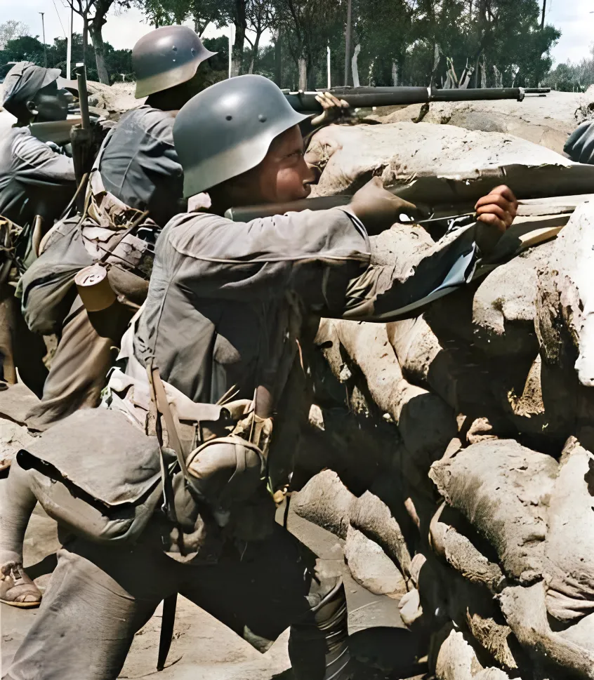 这个钢盔叫M35,边沿圆润,涂层发哑,挎包是仿德式的帆布包,背后那条毯子捆得紧紧的,扣带过洞的位置磨得发亮,说明不是摆拍,真用的,壕沟是沙袋一层一层垒起来的,枪口抵着袋缝,指节因为用力泛白,汗顺着鬓角往下淌,奶奶说当年躲警报窝在地窖里,最怕听见重物落地的闷响,现在我们在屏幕前看战争新闻,指头一划就过去了,可那时候,每一口气都要跟命去抢。