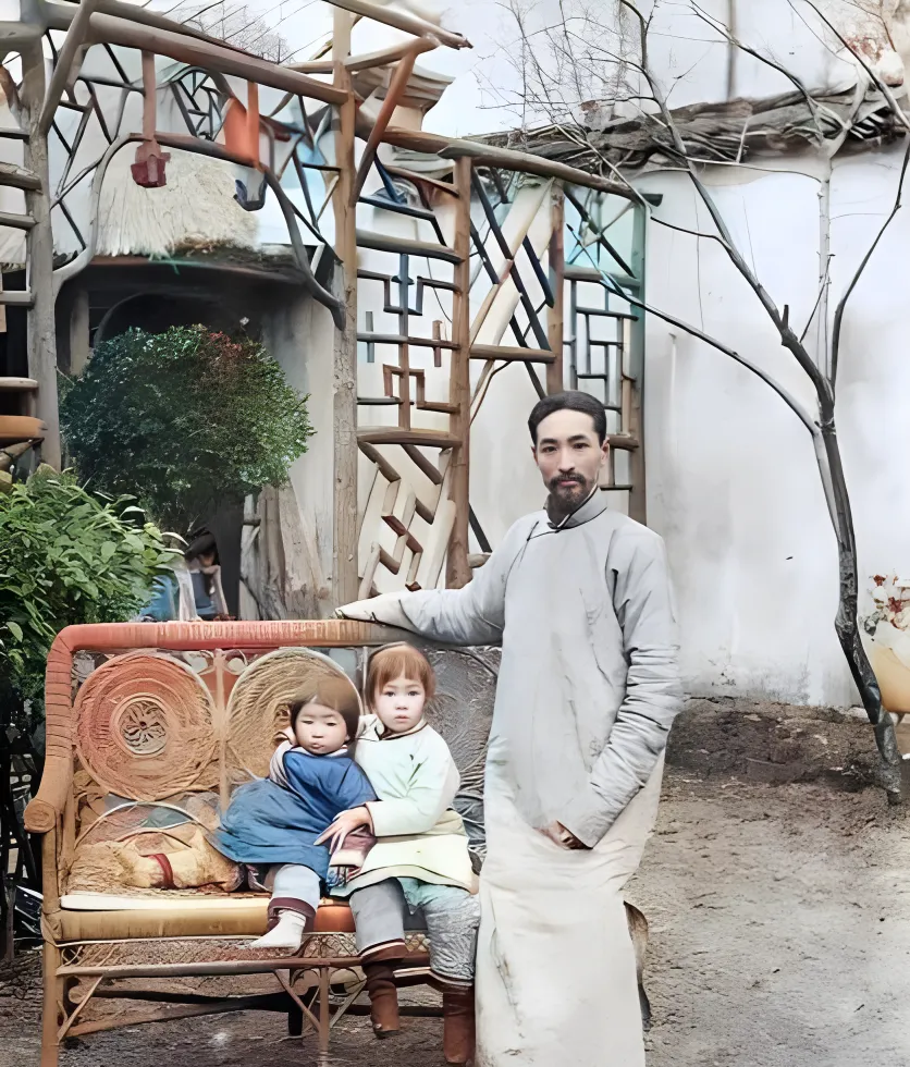 这个坐具叫藤椅,手扶圆润,靠背编了三团旋纹,颜色被岁月养成了蜂蜜色,小姑娘把妹妹揽在怀里,鞋面是软皮的,袜口翻出来一圈,旁边穿长衫的男人站得直直的,袖口很长,露出一截白里往外翻的里衬,小时候我家也有张藤椅,夏天光着脚一坐,藤条缝里咯得脚板心发痒,爷爷会把蒲扇往我腿上一拍,说别抖,抖坏了扣分,现在家里用的是布艺沙发,舒服是舒服,就是一到梅雨天就发潮,哪有老藤条那股子干爽劲儿。