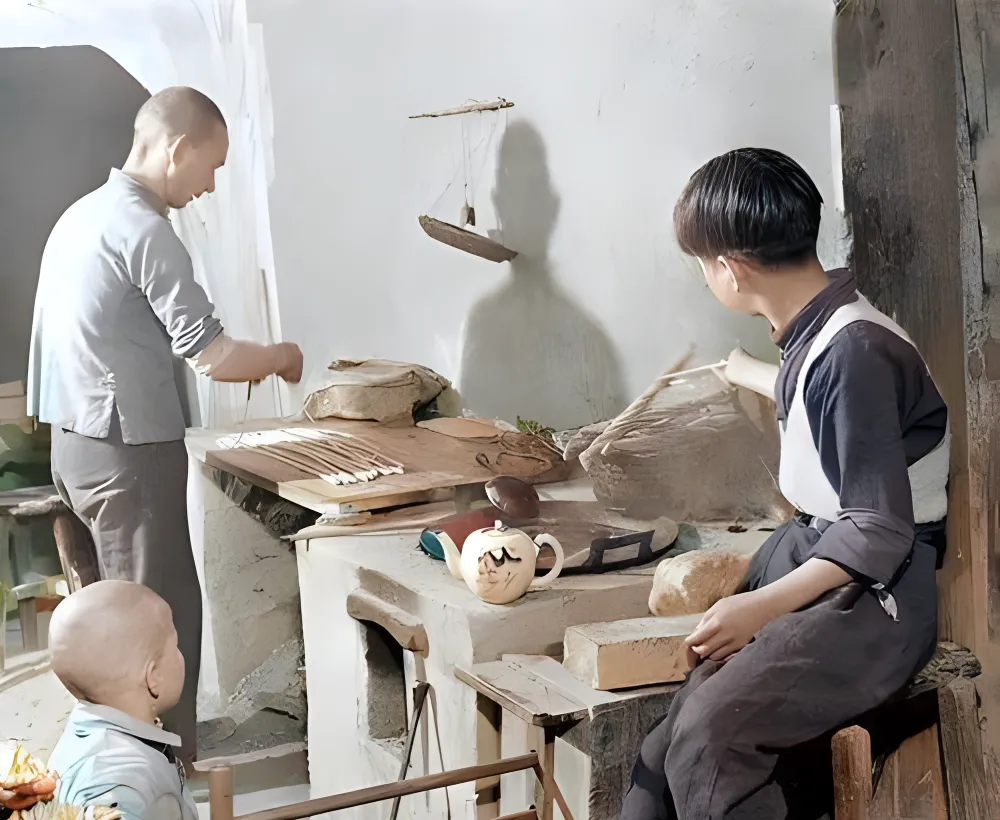 这间像作坊又像简屋的小地方,木桌上摆着工具,墙角挂着秤和旧尺,孩子探着身子看大人做活,灯影打在墙上成了剪影,老照片里常有这种半工半玩的日常,边上人不催,自个儿就学会了,该按的钉子按住,该避的火星躲开,爷爷说“看会儿手再上”,这句话救了我不少次手背,现在我们学东西多是看教程,速度快,记得也快忘,手上那点笨功夫,越发稀罕了。