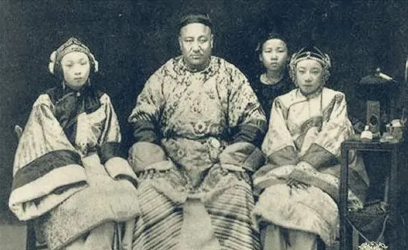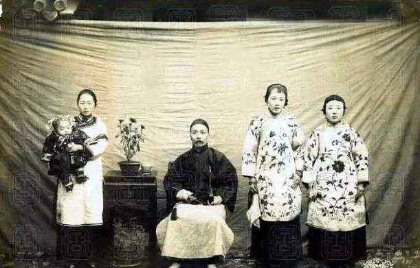 图中这张合影叫“全景位”,男人正中坐着,双手拢在袖里,左右各站着女子,衣摆厚实,绣花密密,最左抱着孩子的多半是正房,孩子才是凭身份说话的凭证,站在右侧的两个,神情拘着,脚尖并拢,这就是妾在镜头里的站位规则,能否靠近主位,一眼就看出来。