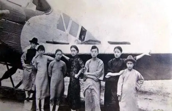 这张算稀罕,姑娘们站在飞机边,长衫、呢帽、卷发,全是新派的行头,里头也混着姨太太,男人做买卖要出洋,带着她们去见世面,回头照样按辈分吃饭,照样在账房外候着签字,时代像这机翼,呼啦一声刮过去,风景变了,身份却没那么快跟上。