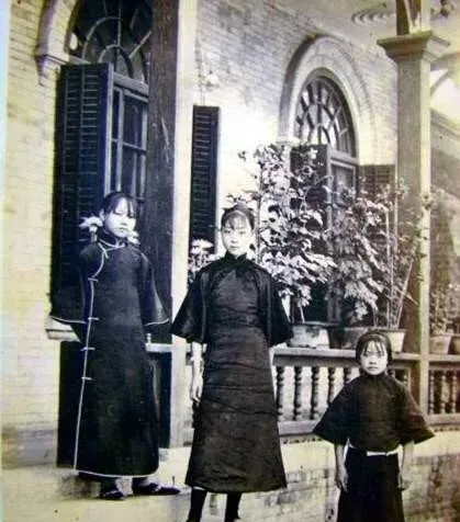 这个三人照叫“家口”,站位一高一低,墙上是拱形窗,铁艺护栏绕着花草,最小的那位多半是丫头或者庶出,手缩在袖里,眼神往上看,习惯了看人脸色行事,旧社会把人分成一层一层的,吃饭按桌,拜年按门,合影也有合影的秩序。