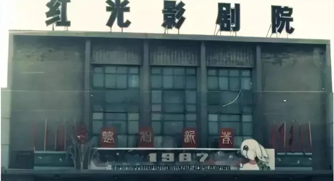 这个大字顶在屋脊上的就是红光影剧院,门楣上黑绿相间的玻璃窗格子一看就老派,八七年的海报还贴在台阶边,妈妈说当年排午夜场,披着外衣在北风里抖抖索索地等,影片一开场,全场齐刷刷地安静,嗑瓜子的声儿像雨点,落在心坎里暖。