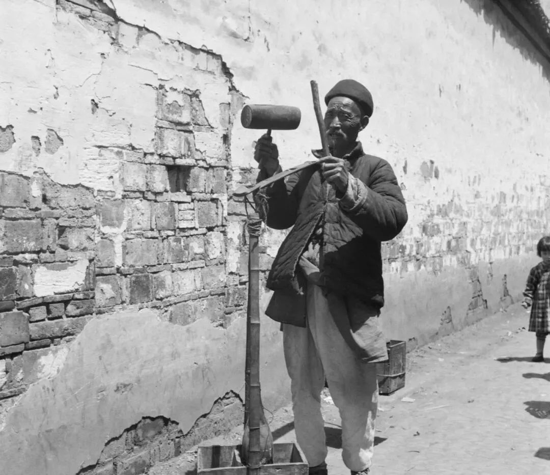 图中这根长杆和木槌叫糖锤,老街口一敲咚咚作响,敲的是麦芽糖块,叮叮当当敲成薄片,孩子们就围上来,掰一角含在嘴里,越含越黏,舌头都被甜得打滑了,师傅身上棉袄打着补丁,腕劲却利索,木槌抡起来一点都不拖泥带水,冬天的风刮得狠,这一口甜就算是过日子的盼头了。