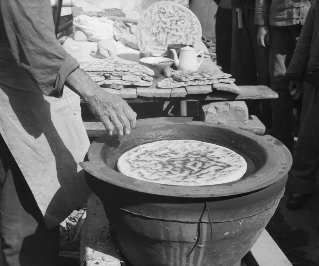 这桌上摊开的是烙饼,面团靠着大缸醒着,案板上拍得满是干粉,师傅掌心一推一旋,饼坯就摊圆了,炉口是陶罐改的,火炭压在底下,不急不躁,饼子慢慢起焦纹,买一张切四块,卷葱段抹酱,走两步就能吃完一半。