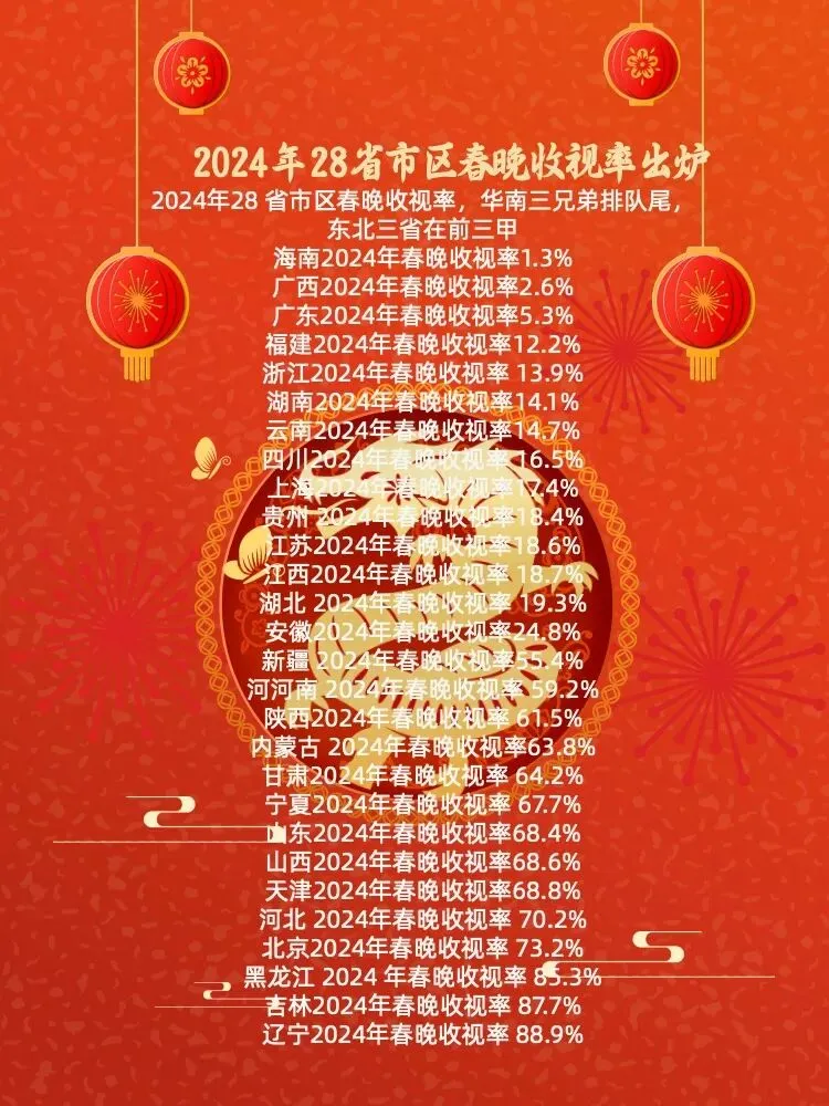 据说今年的春节联欢晚会收视率最高的省份达到90%以上,最低就属于南方F3,这个消息准确吗?