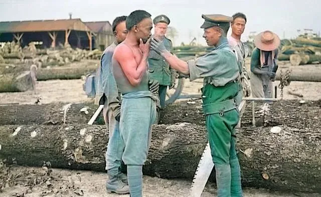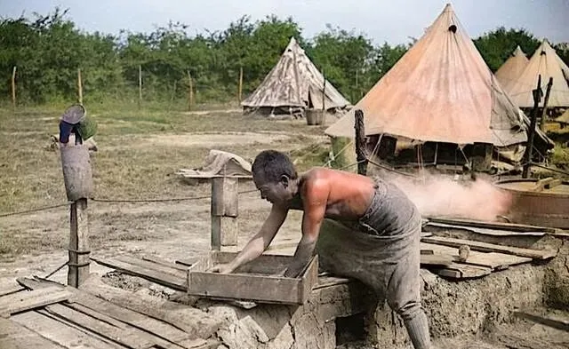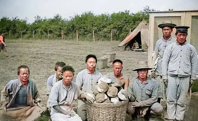 这个大竹篮里头装的是面包坯子,个个圆鼓鼓的,像河里的鹅卵石,劳工们围坐在地上,衣襟敞着风吹得鼓鼓的,脸被日头晒得红里透黑,一个个看镜头的眼神很正,像在说我们也能做细活,把家乡的做法挪到营地里,麦面掺点土豆泥,省面还耐饱,烤出来的皮子脆,里头绵,做完顺手码在篦子上晾一会儿,等军官来点数的时候,篮子一抬就是一餐的量。