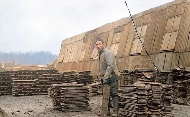 这成摞的东西叫瓦坯,颜色发暗,边角厚,码起来像一堵矮墙,男人手里拎着一块,姿势停在半空,背后一排排木板搭的营房,被风吹得直响,地上糊成了泥塘,瓦坯得一块块抬进屋里烘干,不烤透,雨下一来就软脚,他们把坏的挑出来重新揉,好瓦挑走上房盖顶,抬头看过去,一整片屋面像鱼鳞,这活儿慢,可经得住风吹雨打。
