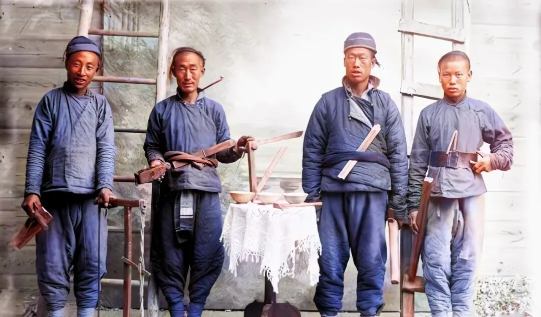 再看这张合影的布置,圆几、茶碗、斧子、梯子硬凑在一块儿,像个舞台,外国摄影师图个热闹,把中国元素全码上,审美不讲究,但留下了细节,腰间别的折尺边角都磨亮了,说明天天掏天天用,照片看着机械,手艺却是活的。