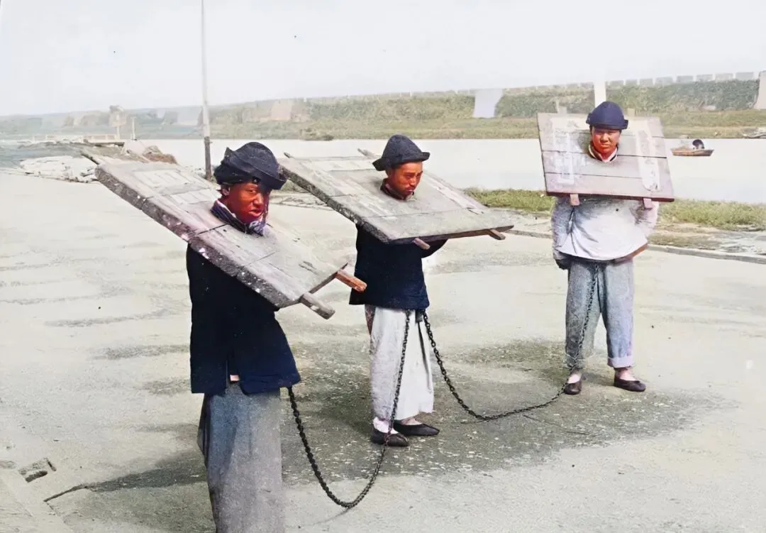 这件木家伙叫枷,厚重的木板在脖颈处开槽,前端用楔子固定,三个人被铁链拴在一处,站在城外的路面上,脸绷得紧,眼神里全是火气,按地方旧例,这样示众要连着十五天,吃喝拉撒都得一起挪,链子往地上一趿,走一步拖一步,声音跟着人群散开去。