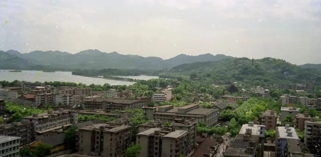 图里这一片开阔的水面叫西湖,山脊一层一层摞在天边,楼房颜色都偏灰,绿树像从画布里冒出来的一样扎眼,屋顶多是平的,偶尔冒一口烟,风一吹就散了,站高处望过去,城和湖是贴在一起的,没有那么多硬邦邦的玻璃墙,线条都软一点。