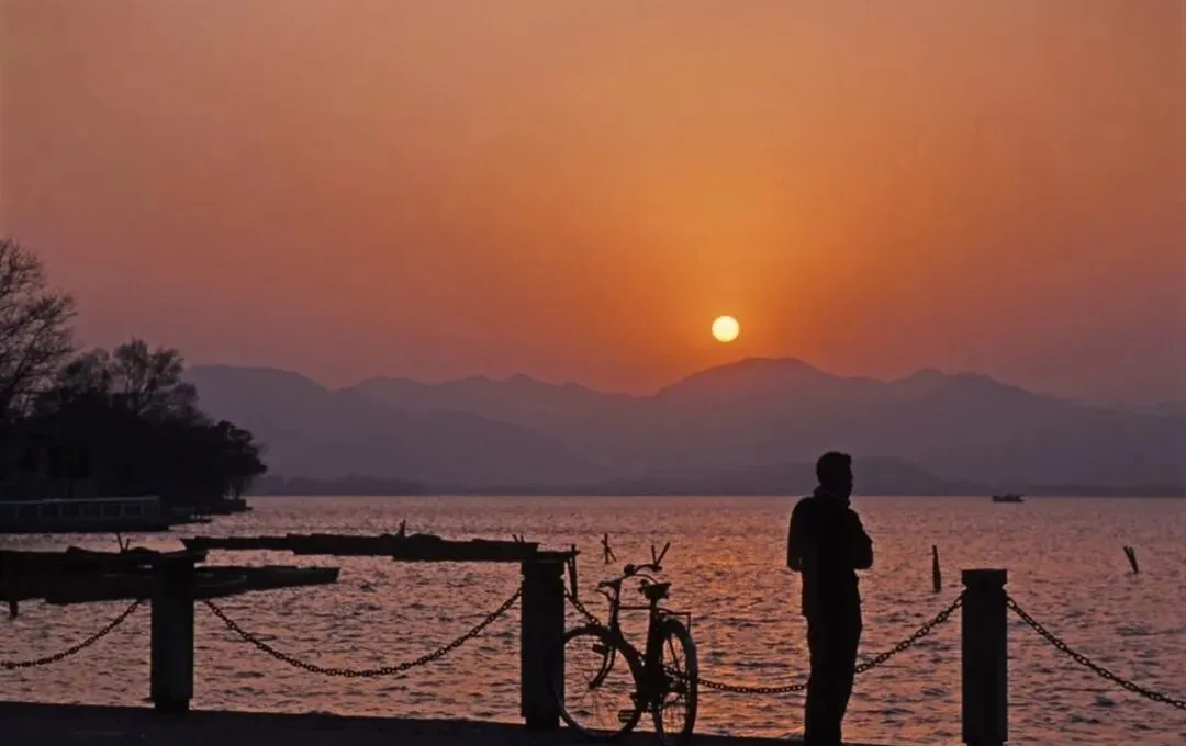 这个剪影就是在湖边等日落的人,身侧倚着一辆细架子的永久牌自行车,太阳像一枚红蛋黄,慢慢往山缝里陷,水面被染得红里透紫,链条上那点油渍,顺着余晖一闪一闪的,我小时候学骑车,妈在后头扶着座,嘴里还念叨着慢点慢点,到了晚饭钟响,湖面边总有几个人不肯走,非要把最后一抹光看完才回家。