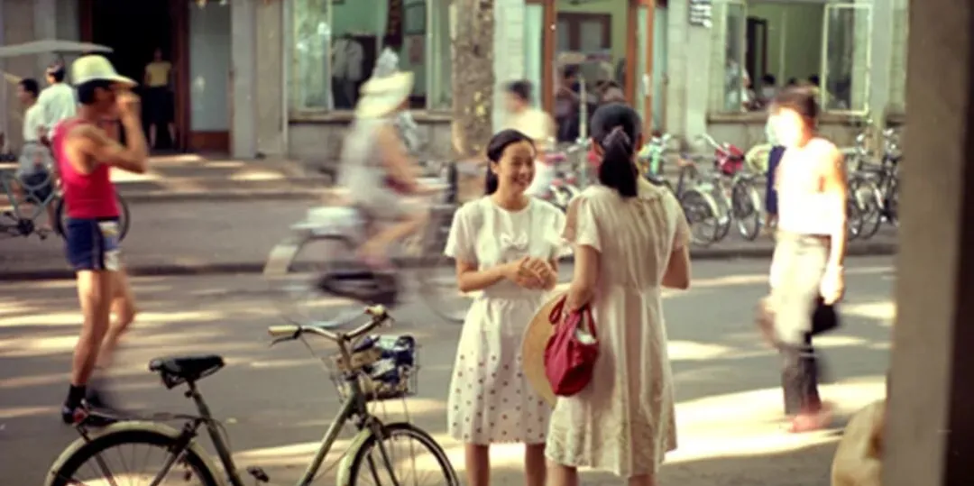 这个街口的场景叫老城的日常,两位姑娘站树荫下聊天,一人捏着红布兜,一人手上拍着草编扇,自行车把手上绑着铃,细细一转就清脆响,背后的人影糊成几道风,男的穿白背心红汗衫,走得急,妹子笑着挪步,像在说新上映的电影票难抢不难抢,妈路过时打趣了一句,你俩站这儿,像两株玉兰开在路口,香得很。